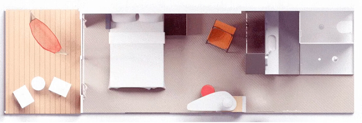 Epic ocean views, whether you are inside on the European queen, or dangling from the sustainable sourced, hand-woven terrace hammock. Complete with nautically inspired brass and leather finishings, Sailors will enjoy this sensory and responsive clever cabin. Just pick up the personal tablet to adjust the mood lighting, music controls, movie streaming or even one-touch room service. Features a supremely comfy European queen that can be set up as two separate beds. Sea gaze outside or head in to freshen up in the upgraded bathroom experience. Sleeps one.